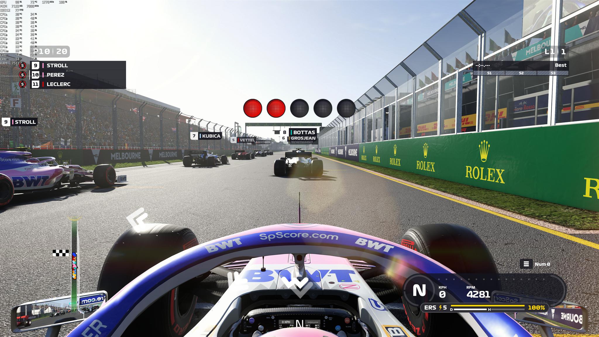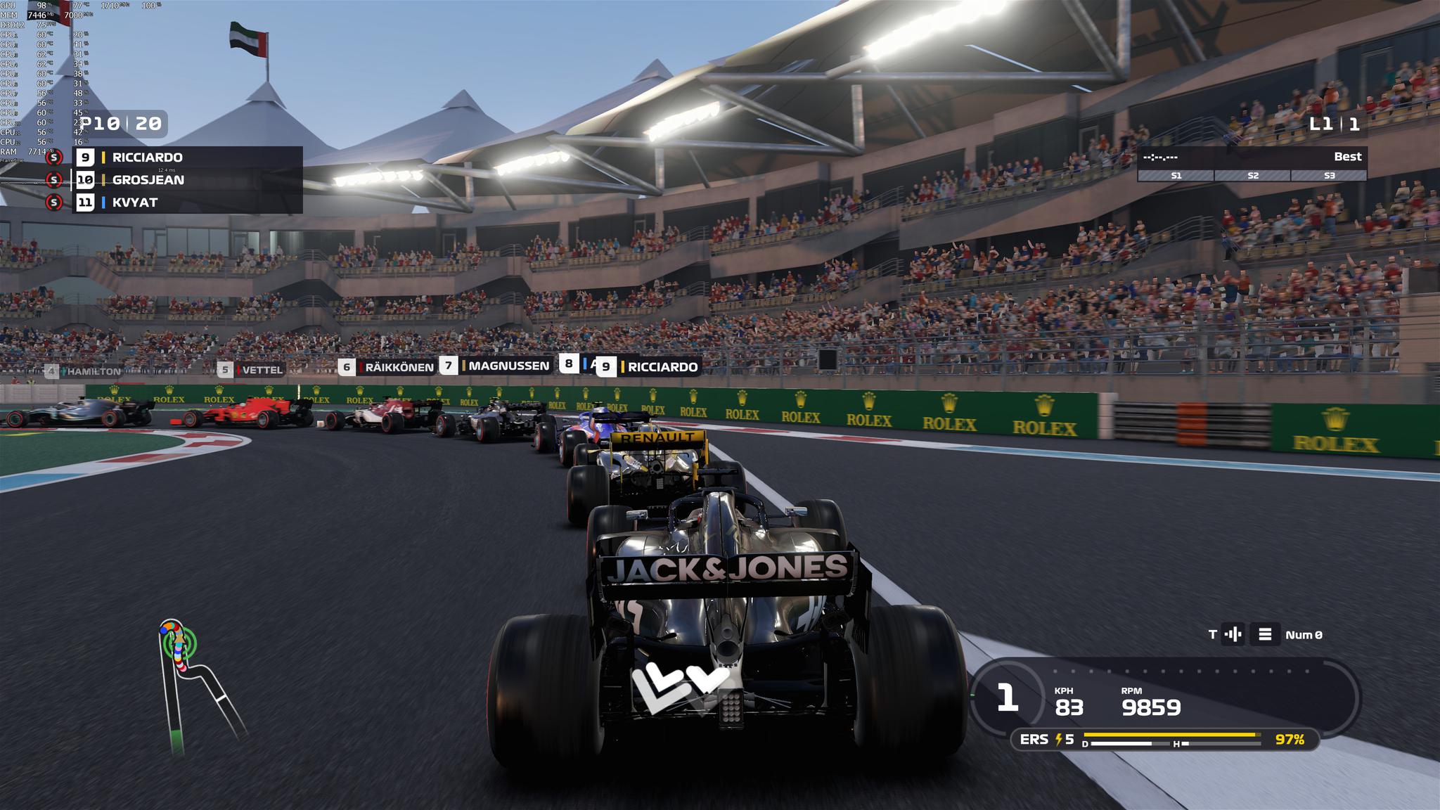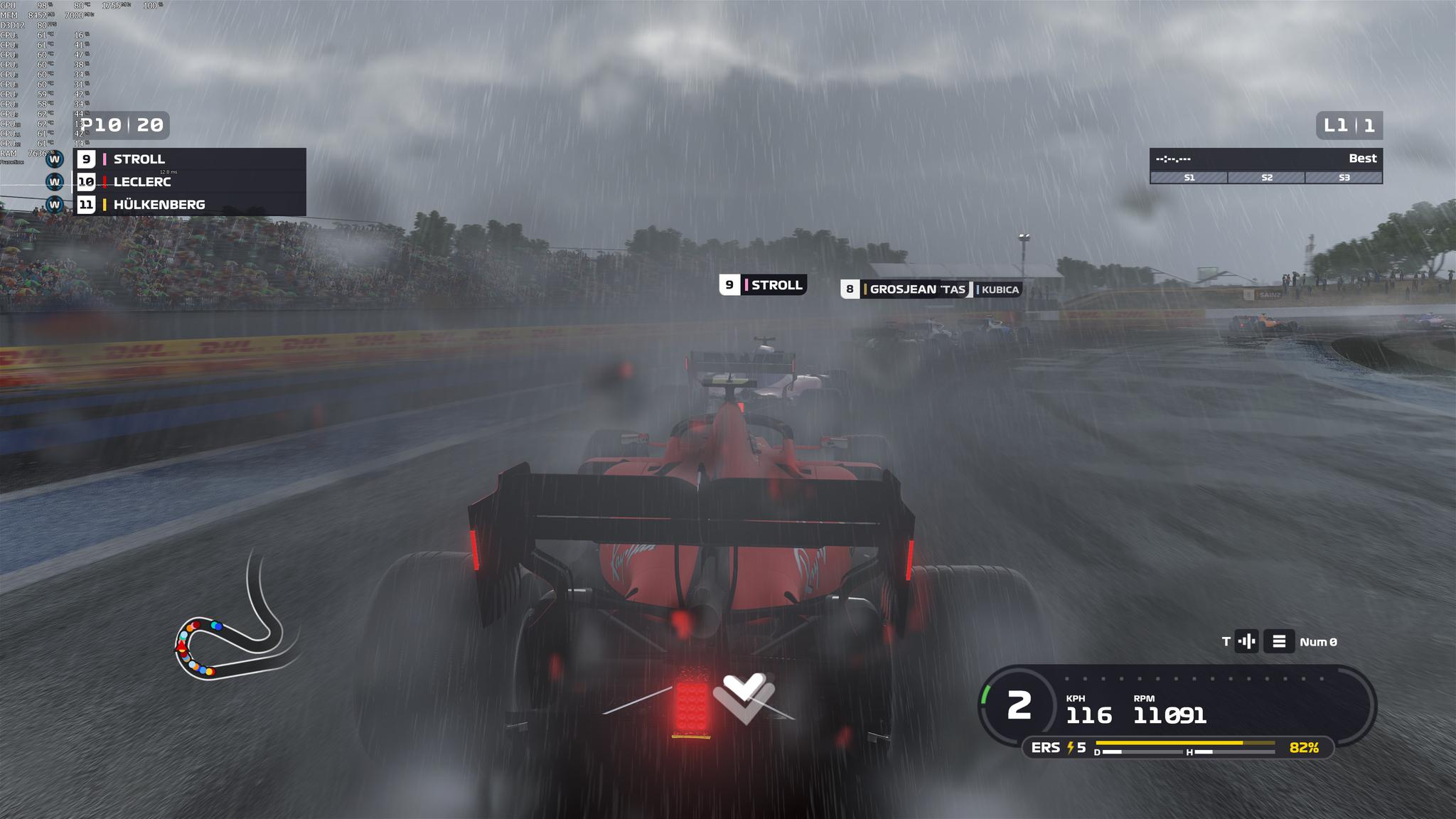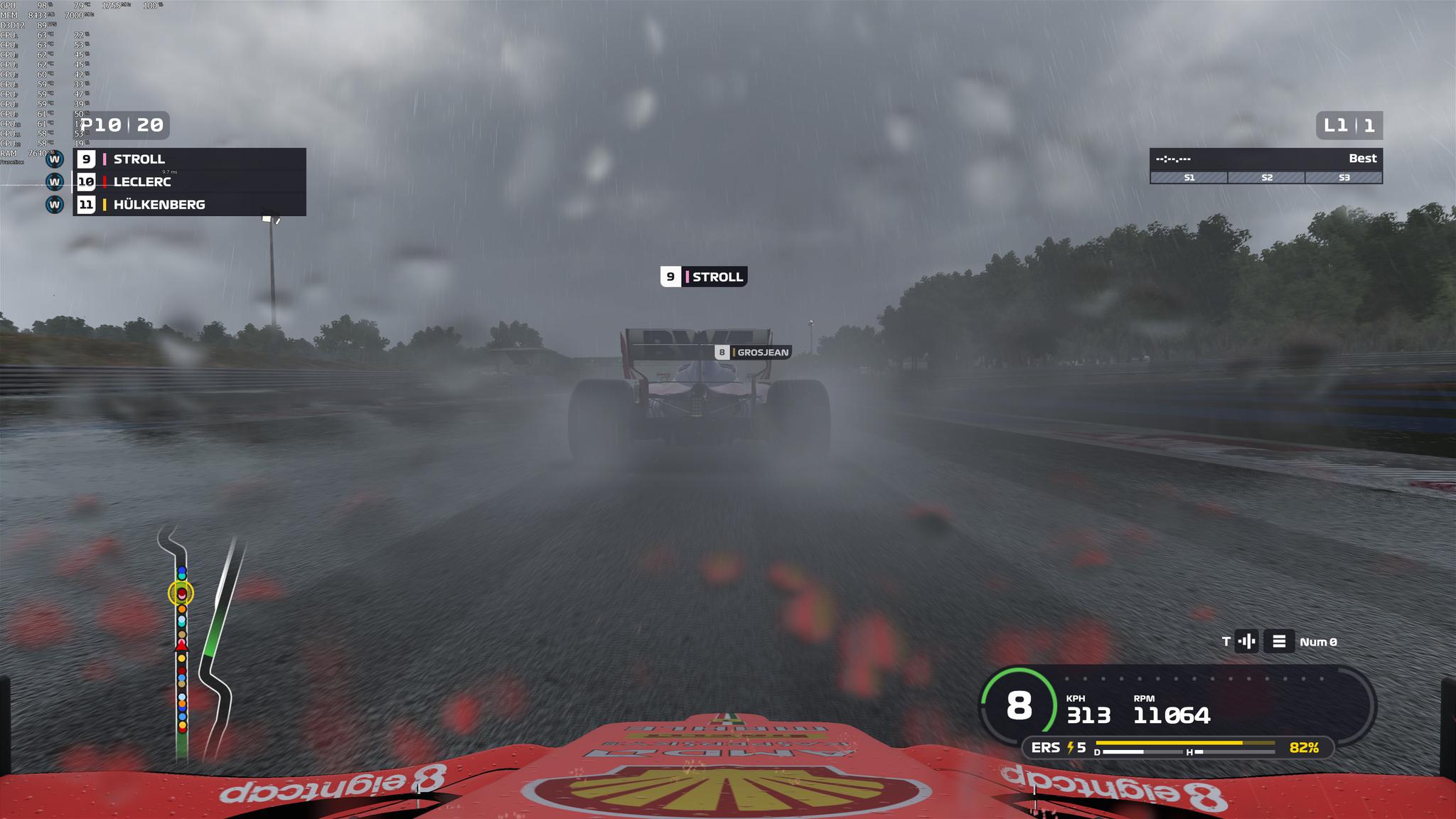 F1 2019支持DirectX 12,NVIDIA GeForce RTX2080Ti能够在4K分辨率最高画质设定下提供稳定的60fps,即便是在画面最复杂的情况下(夜间大雨)。