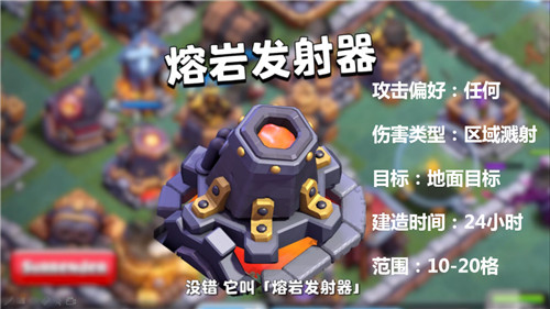 A:熔岩发射器是用于压制地面部队防御设施,在发射熔岩团造成伤害的同时,还会在地面留下岩浆区域,配合城墙可以对地面单位造成相当可观的持续伤害,大幅提升了村庄的反击能力。