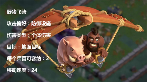 A:野猪飞骑,正如他的名字所表达的那样,是一支飞行部队,主要针对敌方的防御设施。作为夜世界的独有兵种,在继承了野猪骑士无视城墙性能的同时,首次攻击还可使敌方设施陷入一段时间的瘫痪。野猪飞骑进可强行突破防御,退可辅助其他兵种压阵,对目标设施成功实施控制后,还将化身野猪骑士进行地面进攻,是极具侵入性的一支奇袭部队。