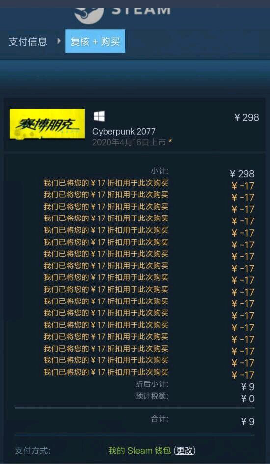 然后点击下面的加速即可兑换代币。加速次数是由点数/1000换算,不满1000算一次,兑换不满1000的部分。加速15次可以获得15000代币,进入维修中心,刚好可以兑换一个17元的折扣券。本次活动兑换的优惠券也是可以无限叠加的,也就是说,只要你兑换的够多,就可以像下图那样,9块钱买个《赛博朋克2077》了。