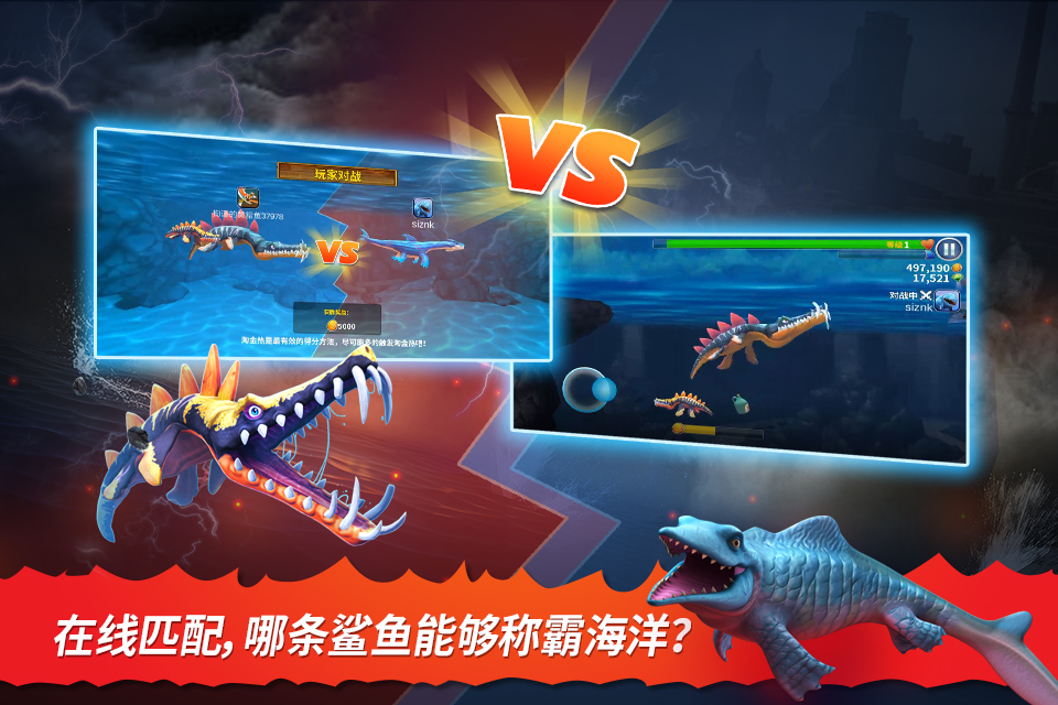 在全新的PVP系统中,玩家可在首页或鲨鱼选择页面进入1V1对战系统。对战鲨鱼种类共有4种,分别是超小型、小型、中型和大型,系统将根据玩家选择的鲨鱼类型进行匹配。完成匹配之后,玩家需要在3分钟的比赛中获得尽可能高的分数。在比赛中,玩家可使用饥饿鲨的一切能力,装备,包括积攒淘金热以获得高分。