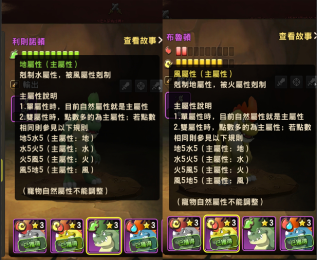 每种宠物还拥有不同的属性,即使是同一系的宠物,不同种类的话,属性也是不一样的。比如同是人龙系下的宠物,“布鲁顿”的属性拥有风属性与火属性两种属性,只是属性的强度不同,而“利则诺顿”则是纯地属性。