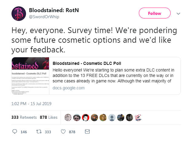 目前计划推出的内容包括首饰、头饰替代品、背饰(围巾、翅膀等)、换装、鞋子、武器和碎片。而调查问卷则包括了女妖、水手服、恶魔、天使、忍者、赛博朋克等等诸多选项,可谓是福利满满了。