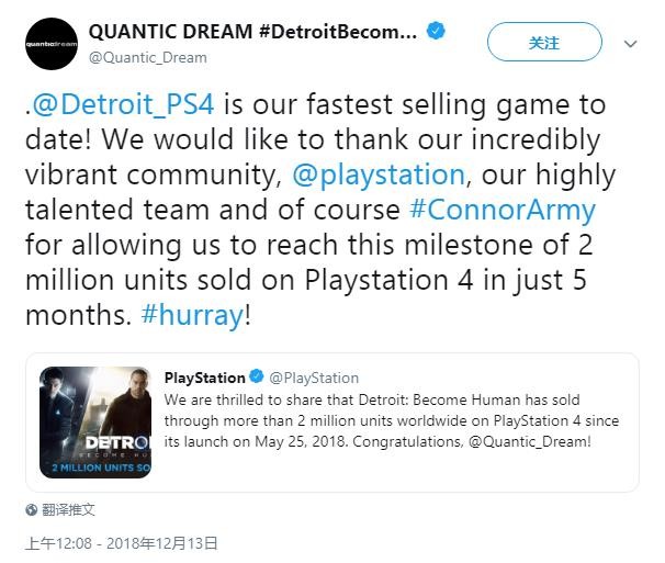 《底特律:变人》在上一年5月发售后,用时两周卖出了100万套,用时5个月卖出了200万套,8个月后销量突破300万。不要看这个销量个其他畅销的3A游戏有很大差距,作为一款此前较为小众的互动电影游戏,它的成绩打破了开发商Quantic Dream的各项记录,成为了他们公司最畅销的作品。