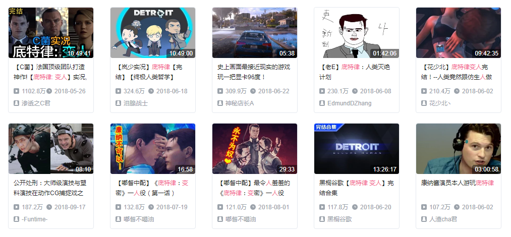 云玩家带起的不是直接销量的稳步提升,而是热度的暴增。根据百度指数中两款游戏搜索指数对比,仅在国内,《底特律:变人》相比同属QD 2013年发售的《超凡双生》最高搜索指数就高出了5倍。B站上的《超凡双生》点击量最高的视频只有30万,而《底特律:变人》点击最高的足足有1000万,还有众多数百万播放量的视频。