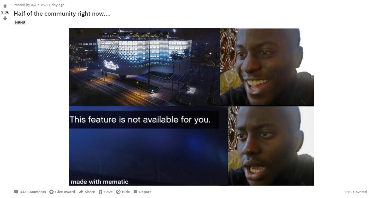 而这个问题也印来了许多玩家的讨论,Reddit论坛上出现了大量无法进入游戏的玩家,以及出现了一些玩家可以购买筹码但无法消费,一些玩家可以参与活动但无法购买筹码的情况。