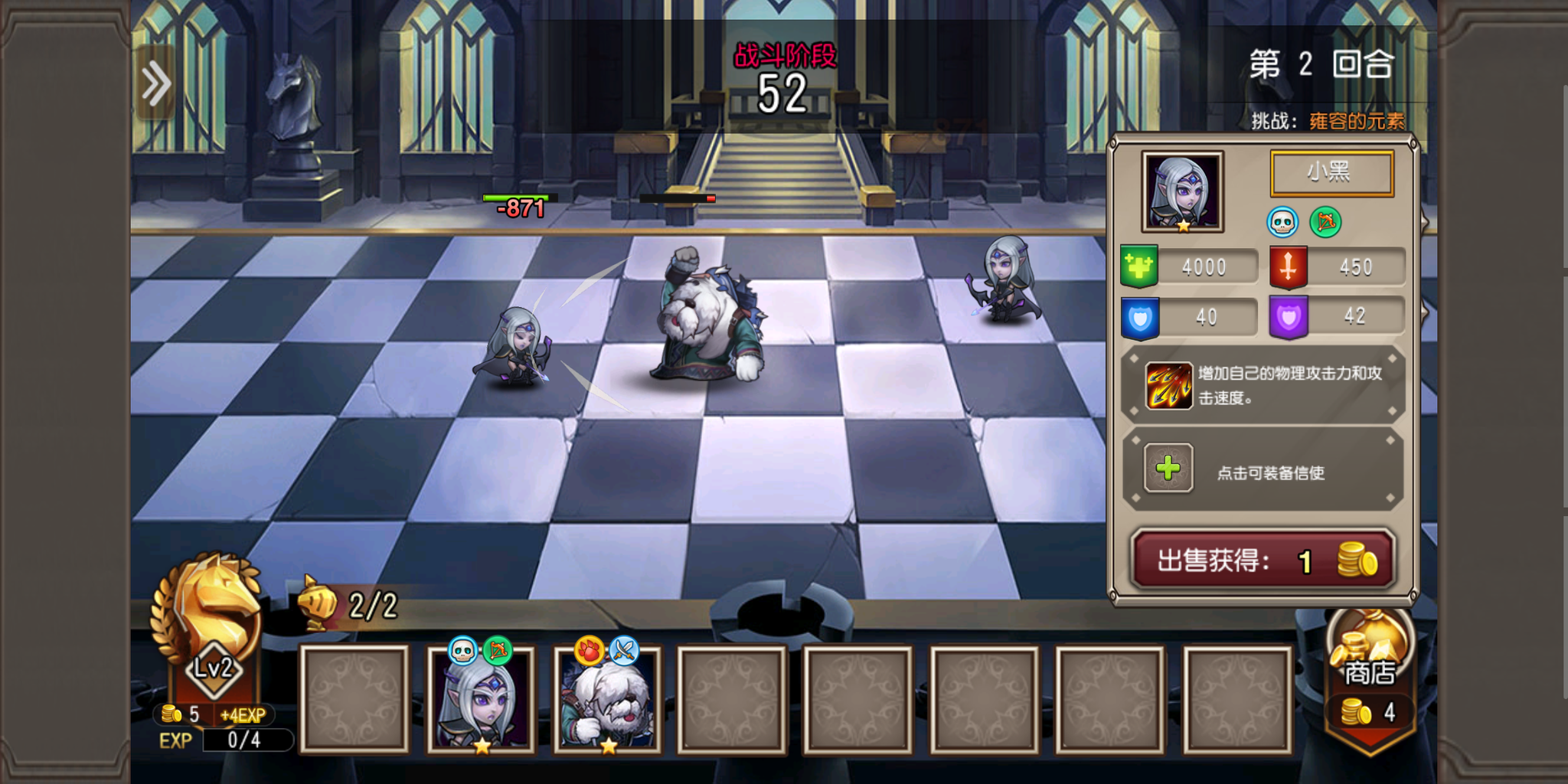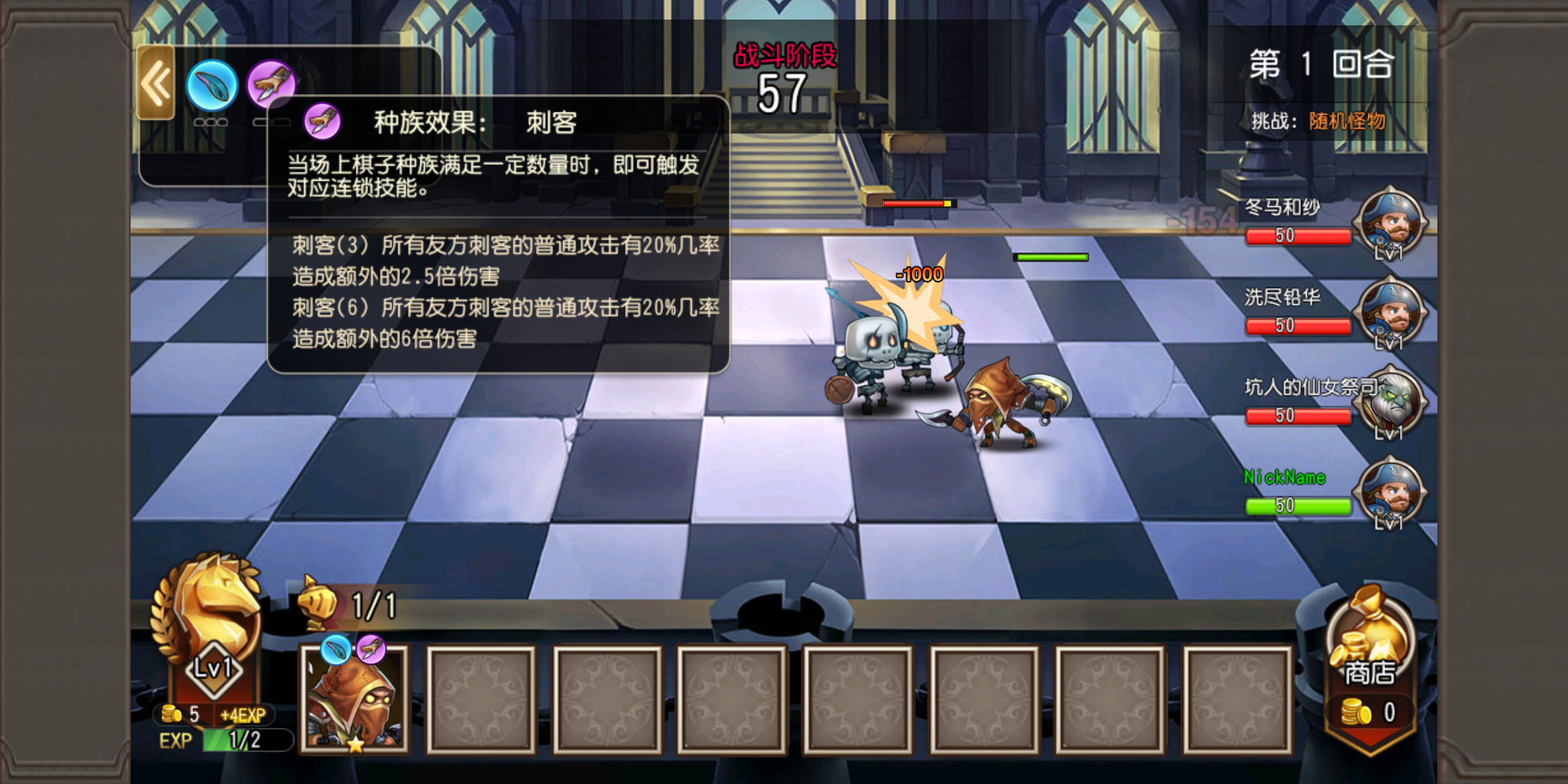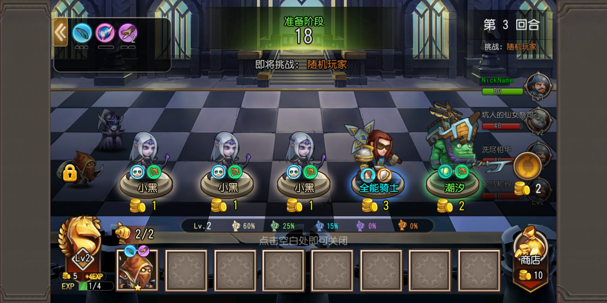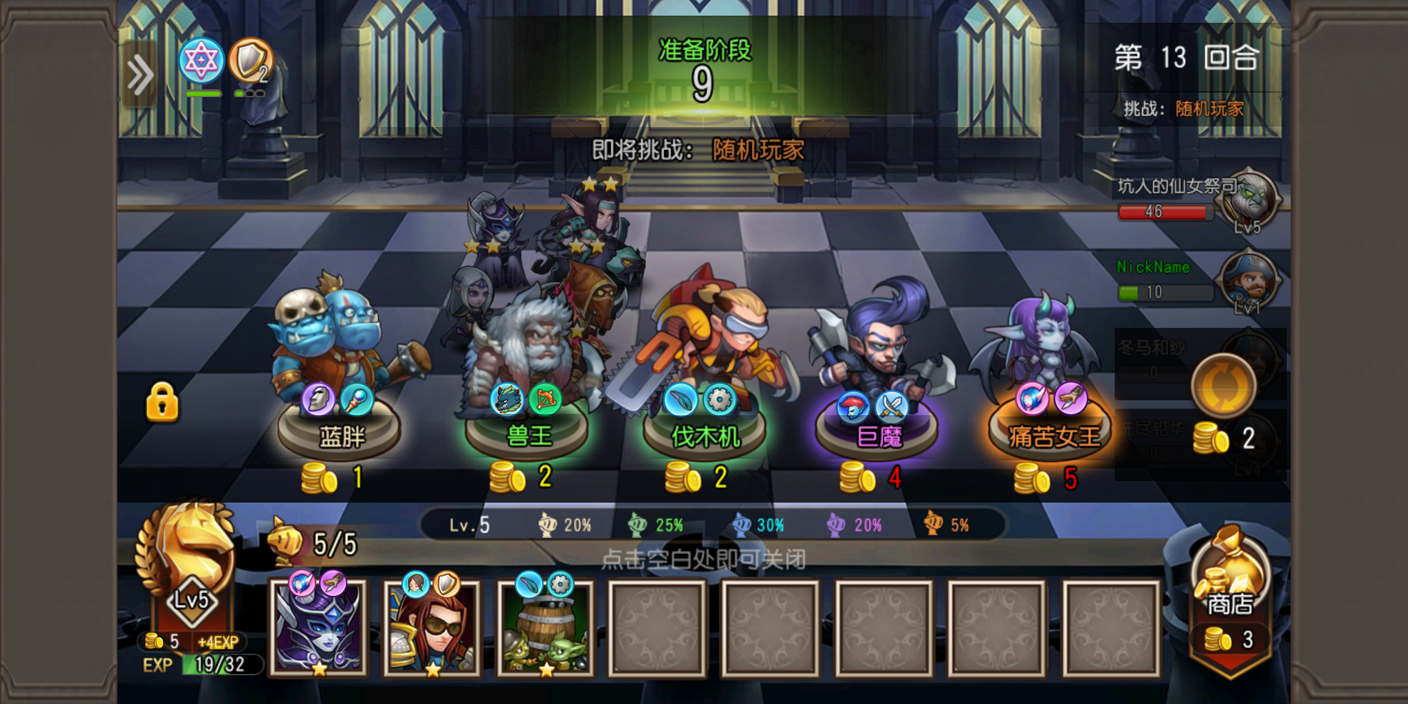 好在棋子的选择界面十分直观,每个棋子的种族都有着标注,底下还写着每种稀有度棋子的出现几率,为玩家们节省了获得棋子信息的时间。如果这一回合自动刷新的棋子不合心意,还可以使用金币进行刷新。