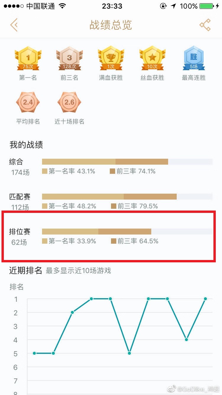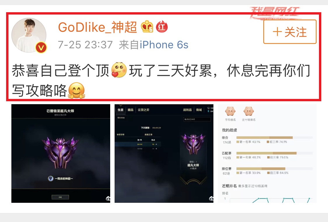 LOL主播神超发博恭喜自己道:“恭喜自己登个顶,玩了三天好累,休息完再给你们写攻略咯”。从战绩来看,神超仅打了62场,第一名率为33.9%,前三率高达64.5%,胜率相当高。