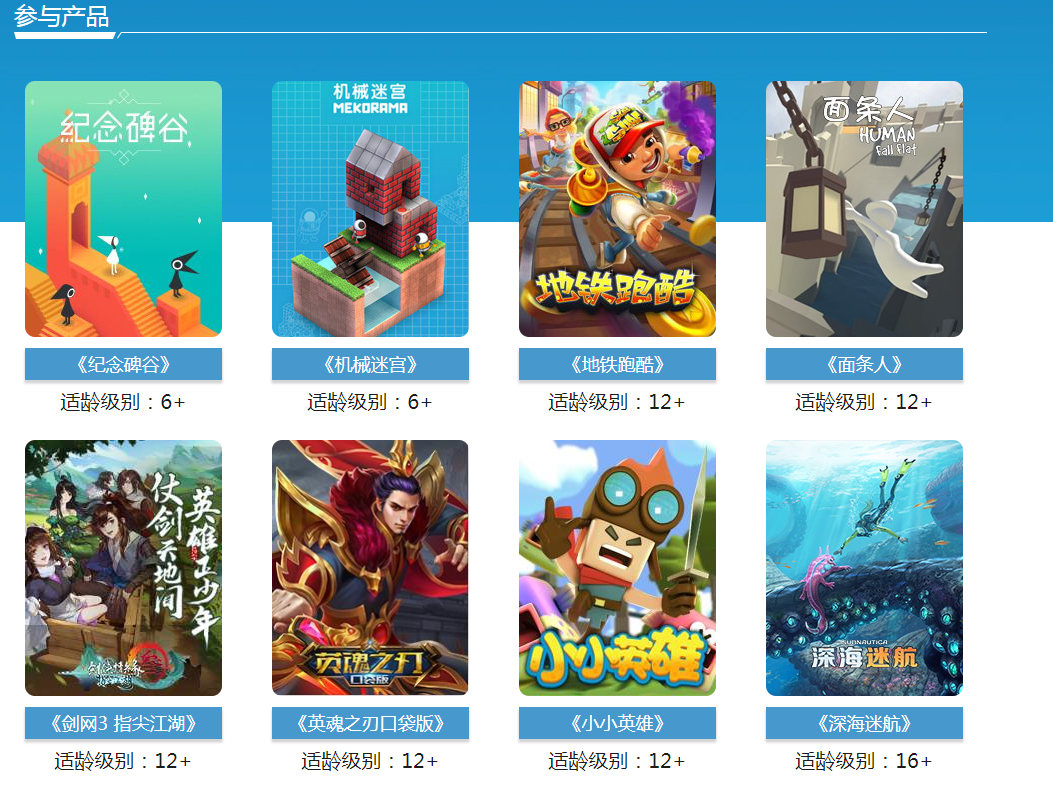 平台上线同时公布了一批参与适龄提示的游戏产品,包括《纪念碑谷》、《地铁跑酷》、《剑侠情缘网络版叁》、《征途》等21款游戏获得了评级,其中《纪念碑谷》评级6+,《剑侠情缘网络版叁》、《征途》则均为18+。