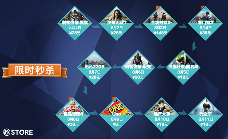 夏季促销期间,每天都将有一款游戏开启“限时秒杀”活动,最低仅售8元!注意,秒杀优惠价格低于促销活动价,仅限当天限时抢购,切莫错过。其中,《全境封锁2》8月3日仅售148元,《看门狗2》4日低至38元。