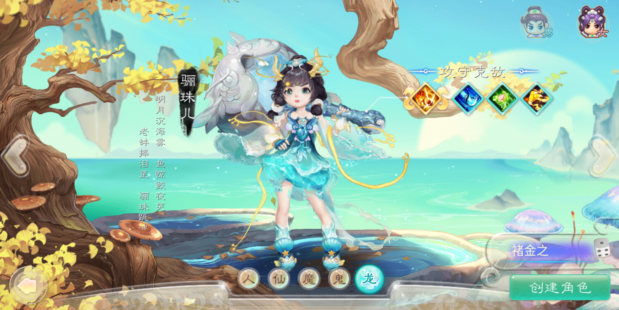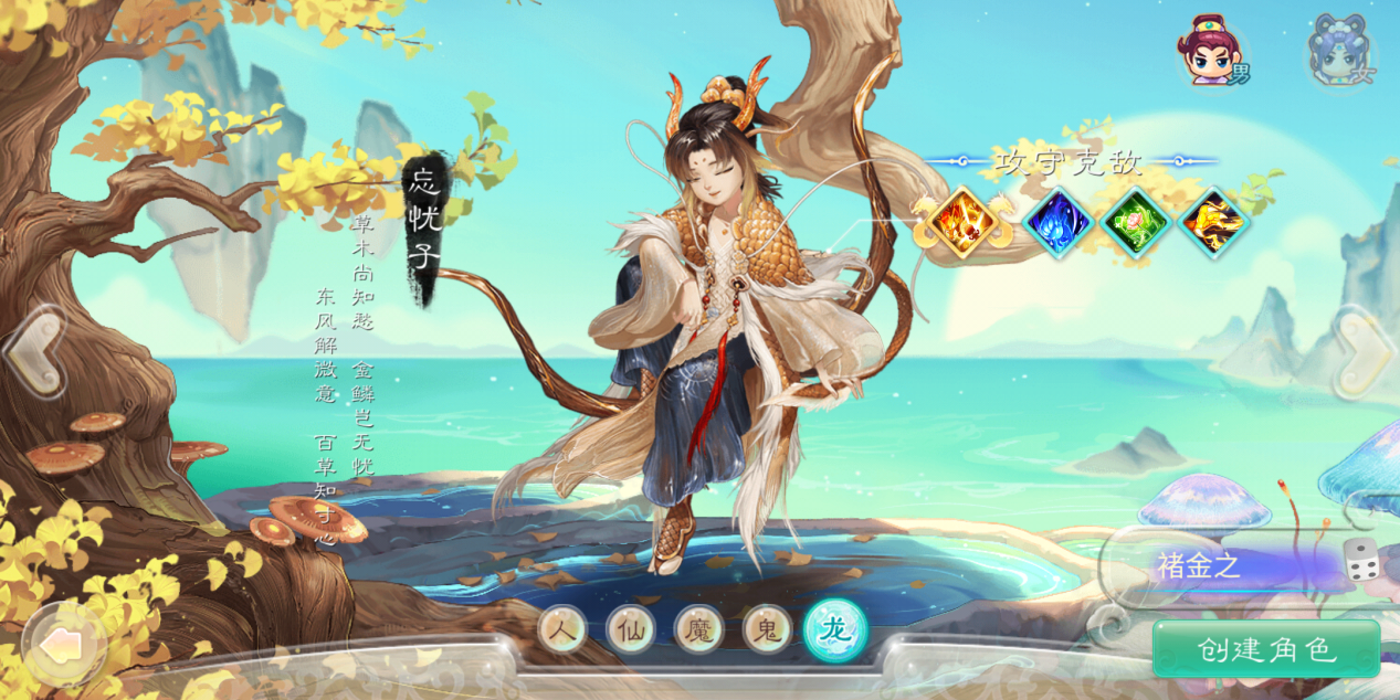 一进入游戏,自然是要创建一个新的龙族角色,目前可用的角色一男一女,分别是“忘忧子”与“骊珠儿”,由于不同的角色所拥有的技能也会不同,所以我索性就都创建一个看看。