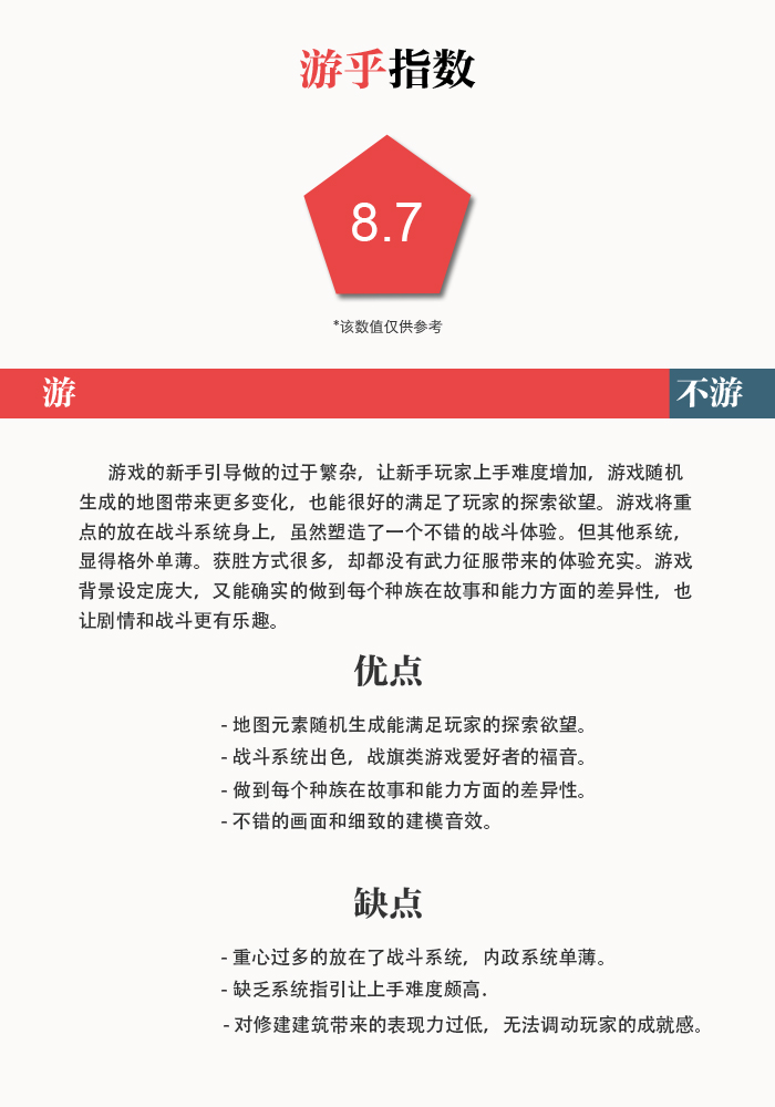 游戏背景设定庞大,又能确实的做到每个种族在故事和能力方面的差异性,也让剧情和战斗更有乐趣。虽然有不少小缺点,但毋庸置疑的是,这是一款值得“回合策略游戏”爱好者入手,新手玩家入坑策略游戏的启蒙作。