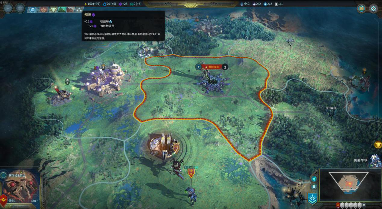 游戏的左上角,将显示玩家所拥有的的资源,资源分为4种,分别是“能量”“宇宙合金”“影响力”“知识”。能量是游戏最基本的物资,玩家几乎所有的操作都会耗费能量;“宇宙合金”是非常珍贵的建筑以及高等兵种建造中的必需品。“影响力”则可以让玩家与其他并未敌对的势力,进行交易和嘴炮劝说;“知识”是游戏中所有科研行为的必须品。