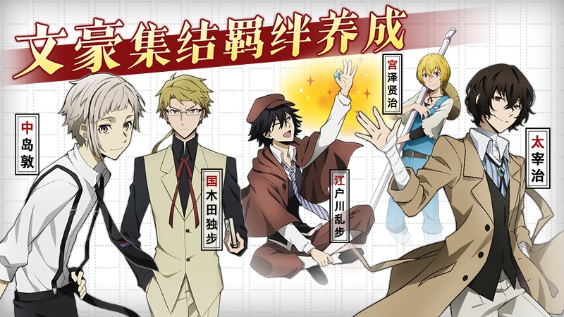《文豪迷犬怪奇谭》上线后将延续日服最新的版本,并且还会实装24张语音卡和场景卡,对动漫剧情作出完美还原。语音卡顾名思义,在游戏中太宰治、中岛敦、芥川龙之介、中原中也、国木田独步等超人气动漫角色都会获得自己专属声优全新配音。而场景卡则会还原动漫中的战斗场景,角色可以获得全员BUFF以便更顺利的闯关。不过为了游戏初期平衡性,在不删档测试初期游戏内并不会上线场景卡的卡池活动,等到国服正式上线后系统还会对玩家作出相应的场景卡积分的补偿。游戏原汁原味,绝对不会给玩家有脱节的感觉,甚至于为了迎接国服的上线,不少第四季《文豪野犬》动漫的剧情还可以在游戏中提前知晓!