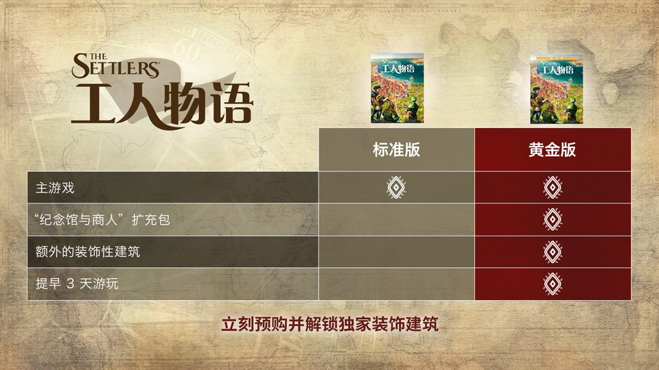 新《工人物语》典藏版:该版本将提供最完整的游戏体验并可提前3天进入游戏,包含扩展包、实体周边等等: