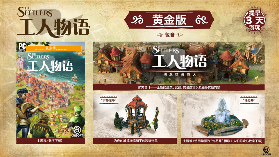 新《工人物语》黄金版:该版本允许玩家提前三天进入游戏,并包含扩展包“纪念馆与商人”以及2件装饰道具:宁静凉亭以及许愿井。