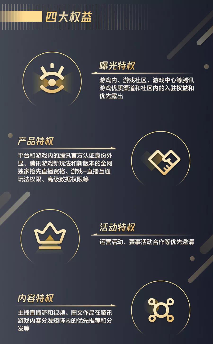 为了吸引主播参与,主播认证计划除了给予官方认证外,还公布了曝光特权、产品特权、活动特权和内容特权四大权益,包括但不限于腾讯旗下游戏内外部渠道优先露出,新玩法和新版本抢先直播资格,赛事活动优先邀请,以及直播流优先推荐和分发等支持。