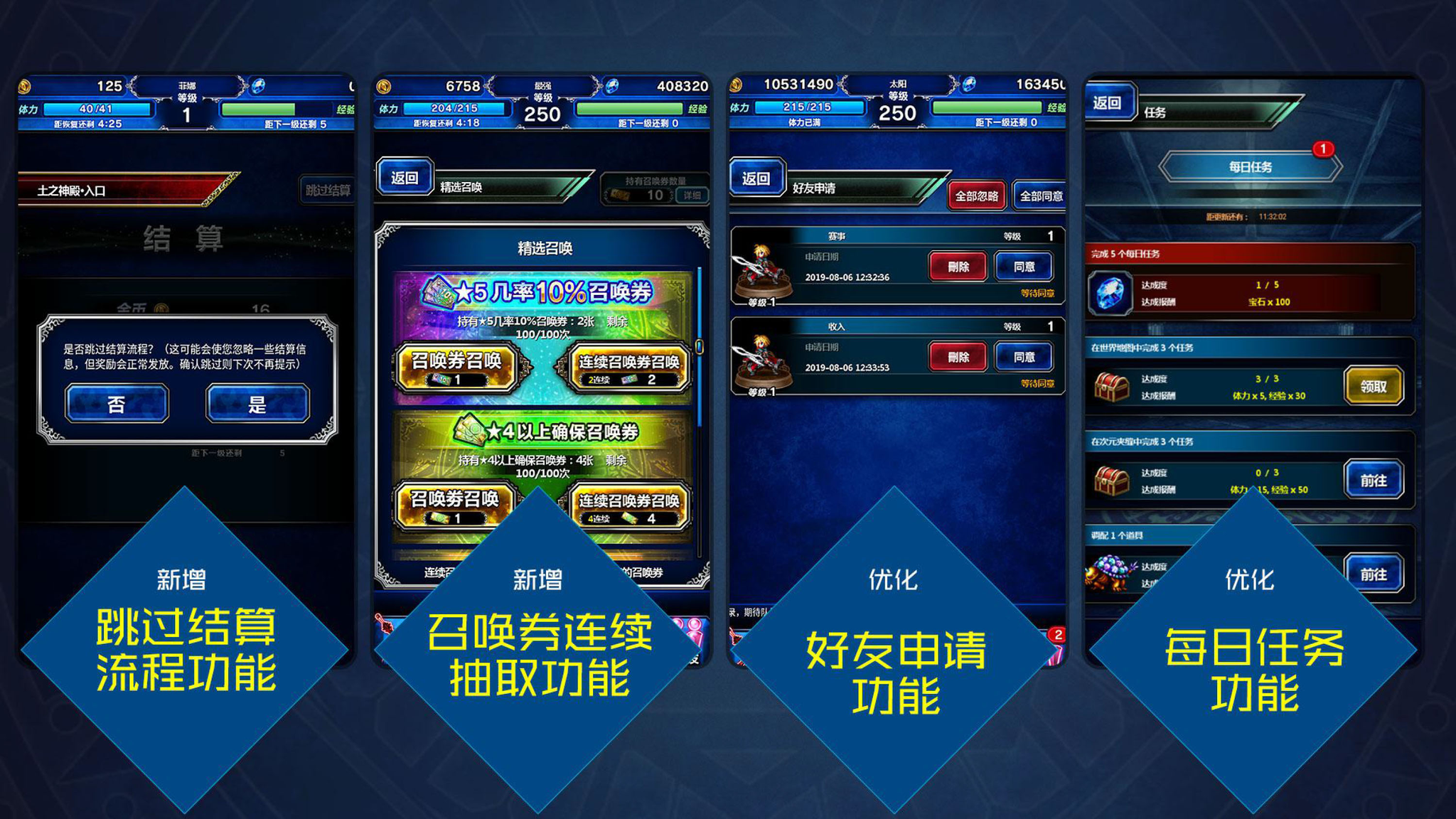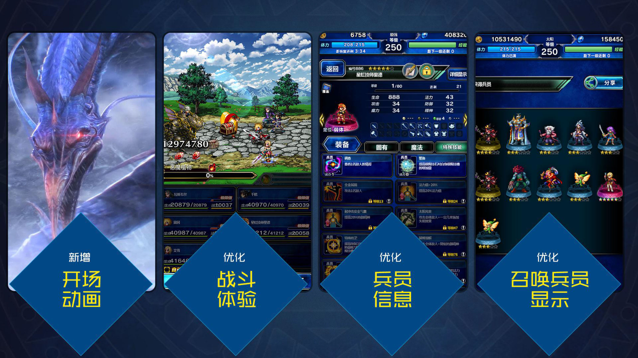 《FFBE》国服将通过优化游戏UI的各方面内容,清晰、细节化指引功能,让玩家的游戏目标更加明确,在游戏中的阶段目标有迹可循。通过简化操作流程,使游戏的各项操作更加便利。并从各种界面显示动画速度的优化,到各种“一键设定”,最大程度化减少冗余操作,而这些设定都是为了让这款日式手游在国服不会陷入“水土不服”的境遇。