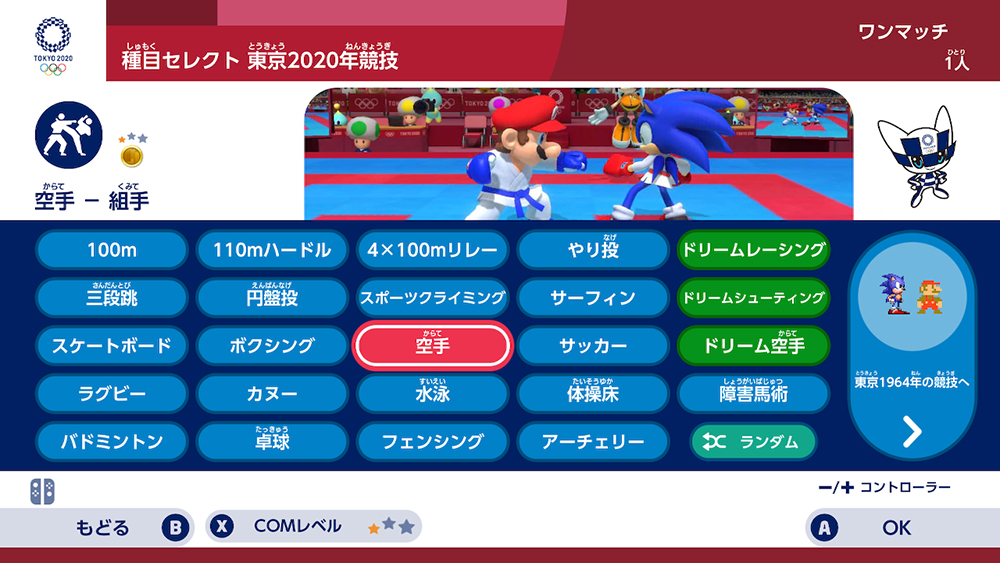 2020年东京竞技项目·21种竞技项目、梦幻竞技·3种竞技项目、1964年东京竞技项目·10种竞技项目都可以1个人练习。按键操作对应所有的项目,根据竞技项目不同会有对应使用Joy-Con的体感操作。