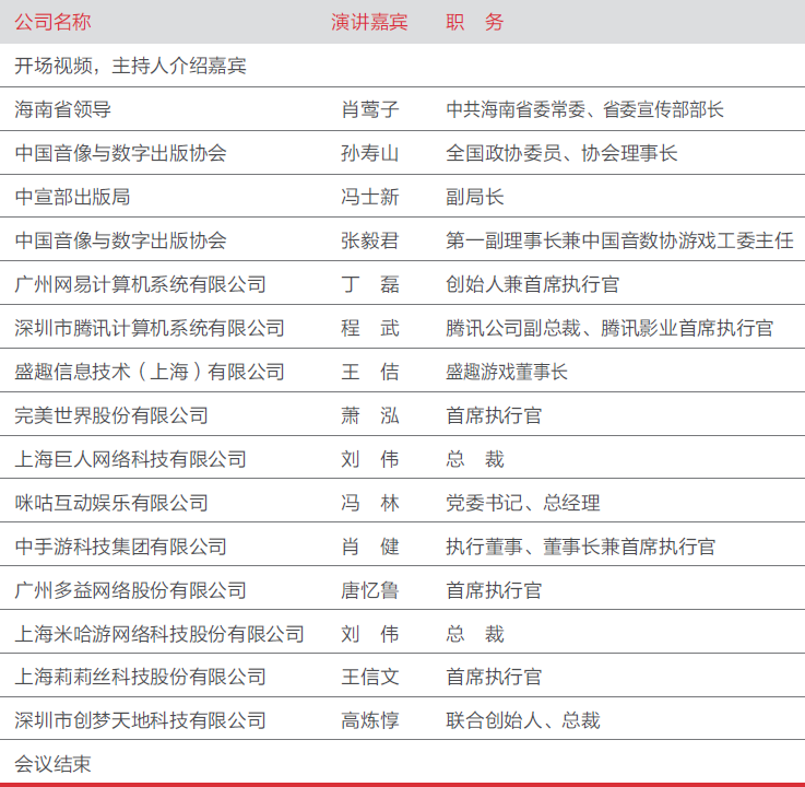 由国家新闻出版署主管,中国音像与数字出版协会、海南省新闻出版局、海南省工业和信息化厅主办,中国音数协游戏工委、海南生态软件园承办的2019年度中国游戏产业年会将于2019年12月17日至19日在海南海口市鲁能希尔顿酒店举办。今日,主办方公布产业年会大会的主要日程及嘉宾阵容,方便与会者参看。
