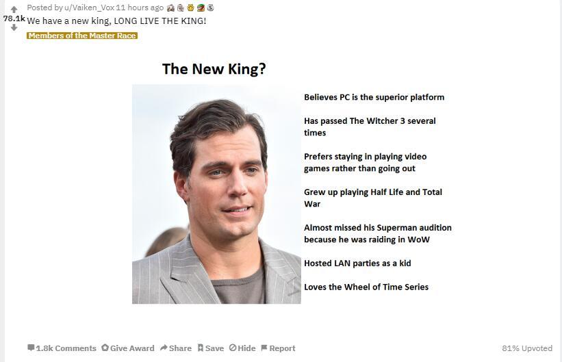 在《巫师》电视剧中出演白狼一角的“大超”亨利·卡维尔最近频繁发布和游戏有关的言论。最近大超又称“PC是第一平台”而被Reddit玩家封为“游戏界的新王”。