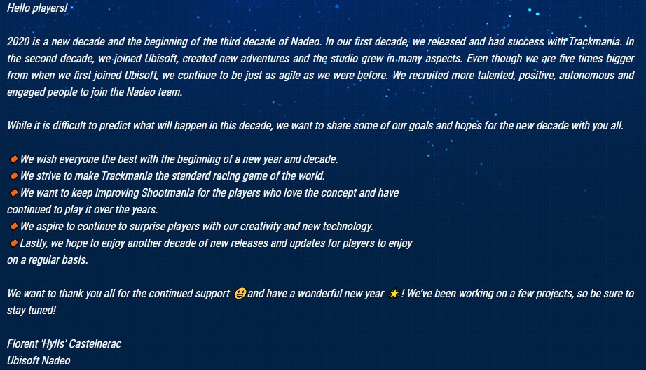 来自育碧的制作组 Nadeo 在2020年到来后向广大游戏玩家们送上了自己的新年祝福,作为知名竞速游戏《赛道狂飙》系列的开发商,Nadeo 表示他们希望能在新的十年里让《赛道狂飙》成为竞速类作品的新标杆。