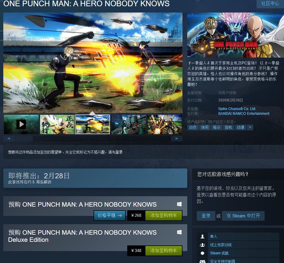 《一拳超人:无名英雄》现已在Steam开启预购,国区标准版售价268元,豪华版售价348元,定于2020年2月28日发售,支持简体中文。