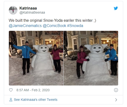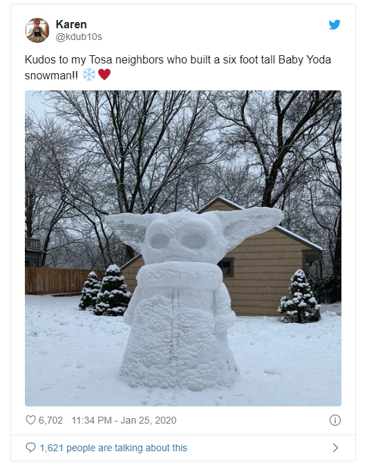 其中有些网友打造的尤达宝宝雪雕非常庞大,例如来自威斯康星州Wauwatosa的6英尺高的Snowda;此外也有一些微型尤达宝宝雪人,例如来自安大略省渥太华的大耳Snowda。