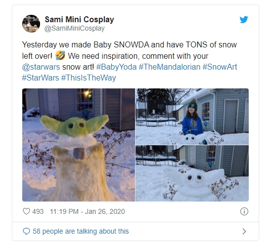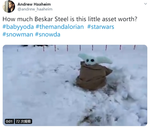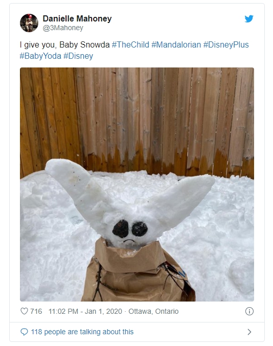 据外媒CNET报道,近日北美多地遭受到了冬季暴风雪的袭扰,但这恰好为美国和加拿大大量的星战迷们提供了打造可爱的尤达宝宝雪人“Snowda”的绝佳机会。自迪士尼星球大战真人剧集《曼达洛人》播出后,尤达宝宝成为了广受网友喜爱的角色。