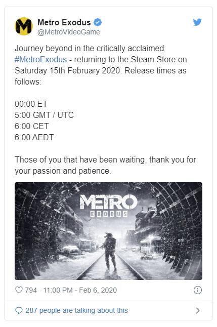 消息来自4A游戏的社交媒体渠道。开发人员在推特上写道: