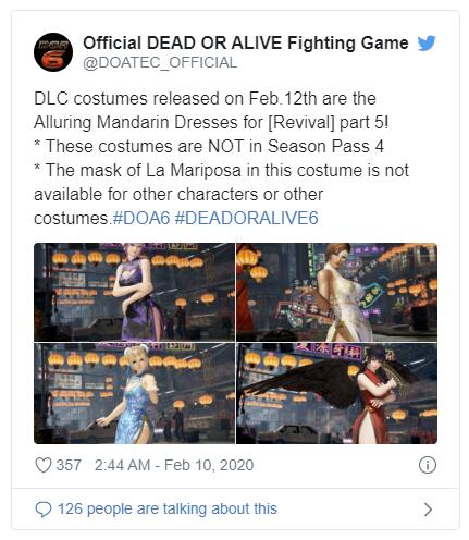 下面是丽莎、玛丽·罗斯、女天狗和绫音的截图。当DLC在2月12日与1.19补丁一起推出时,其他的角色服装会公布,1.19补丁也将包括对soft body物理特效的调整。