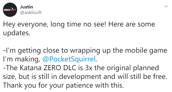 今日(2月15日),精品独立游戏《武士 零(Katana ZERO)》的开发商 askiisoft 在发推介绍了自己的一些近况,其中提到了《武士 零》的DLC开发情况。