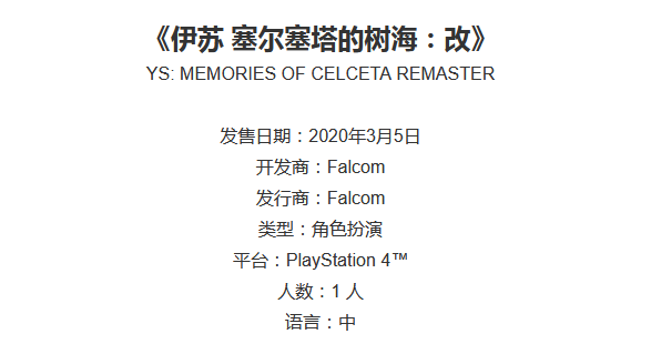 PC版《伊苏:塞尔塞塔的树海》目前已经加入日文语音,Steam库里有这款游戏的玩家可以尝试着体验一下。PS4中文版《伊苏 塞尔塞塔的树海:改》将于2020年3月5日正式发售,感兴趣的玩家也可以了解一下。