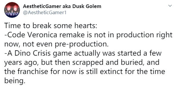 曾准确泄露《生化危机3:重制版》的内部人士AestheticGamer今日发推,又曝光了一些内幕。根据AestheticGamer,《生化危机代号:维罗妮卡》重制版当前并未在开发中,甚至都没有进行预制作。
