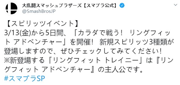 今天(3月11日)《任天堂全明星大乱斗:特别版》官方 Twitter 宣布,任天堂旗下人气健身游戏《健身环大冒险》将与《任天堂全明星大乱斗:特别版》展开联动,来自《健身环》的三个命魂将在3月13日起的5天时间内限时加入到游戏当中。