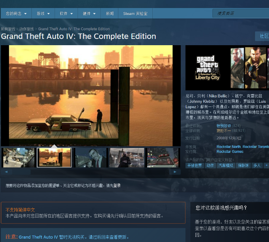 《GTA4》Steam版之前因为微软正式停止了对Games for Live的支持而不得不下架,后来R星宣布本作将在3月19日回归,以完整版取代原版和“自由城之章”。目前《GTA4:完整版》已在Steam上架,将于3月24日恢复购买。