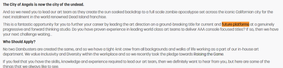 “我们需要你领导我们的美术团队,他们正为世界知名的《死亡岛》系列的下一部作品创作,将阳光浸透的背景加入到完整规模的僵尸末日设定,横贯标志性的加州城市。这是一个绝佳的机会,让你在一个真正进步和前卫的工作室里,领导艺术方向,为当前和未来的平台创造一个开创性的游戏,从而推进你的职业生涯。你是否有领导世界一流美术团队开发3A主机游戏的成功经验?如果有,那么我们将为您提供下一个挑战。”