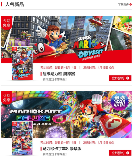 今天(4月10日)Nintendo Switch 国行玩家期待已久的《超级马里奥:奥德赛》与《马里奥赛车 8:豪华版》实体卡带,现已在 Switch 官方旗舰店上架。据商店页面信息显示,这两款游戏的售价均为299元支持6期免息,将于4月15日零点正式发售,想要入手的玩家们现在就可以进行预约。