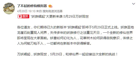 万妖崛起,妖族现世,5月29日,和修仙界一起迎接这次全新的挑战!