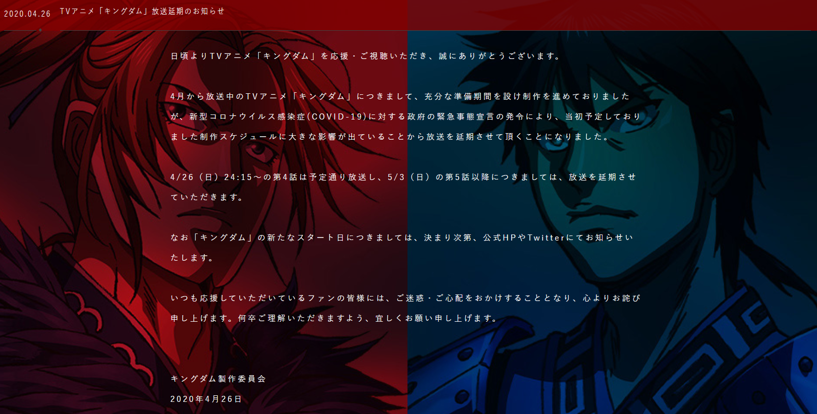 根据TV动画《王者天下》官方公开的新消息,该动画第三季的第四话播出后,将从第五话开始延期放送,原因是受到了新冠病毒疫情的影响。