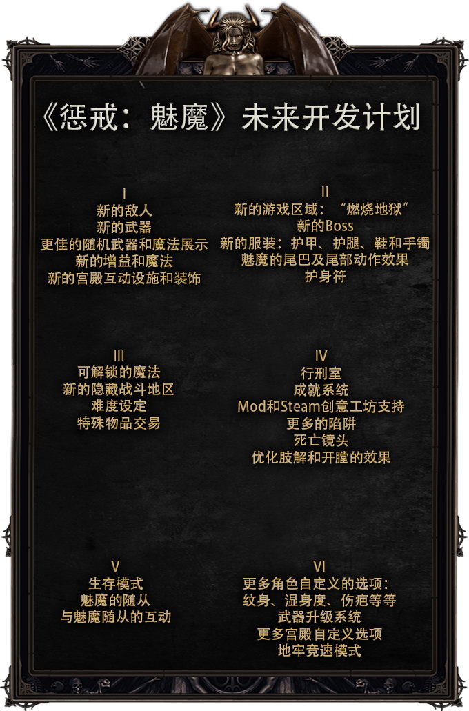《惩戒:魅魔》已更新新版本,优化了战斗系统及游戏机制,修复诸多Bug。官方还公布了《惩戒:魅魔》未来开发计划,将加入行刑室等新系统,并开放创意工坊让玩家能自制Mod,还有更多服装,敌人和武器等。