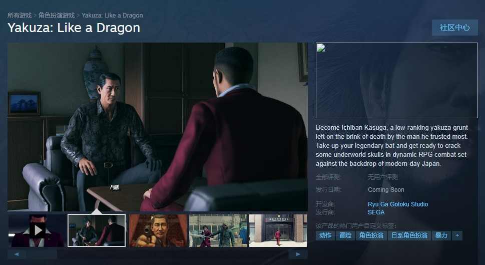 今天(5月8日)在 Inside Xbox 上宣布将首发登陆 Xbox Series X,并推出 Xbox One 与 PC 版的《如龙 7》,现已在 Steam 平台开启了预购页面,不过目前本作在 Steam 平台尚处于锁国区状态,喜欢《如龙 7》的 Steam 玩家可以将其加入到愿望单中。