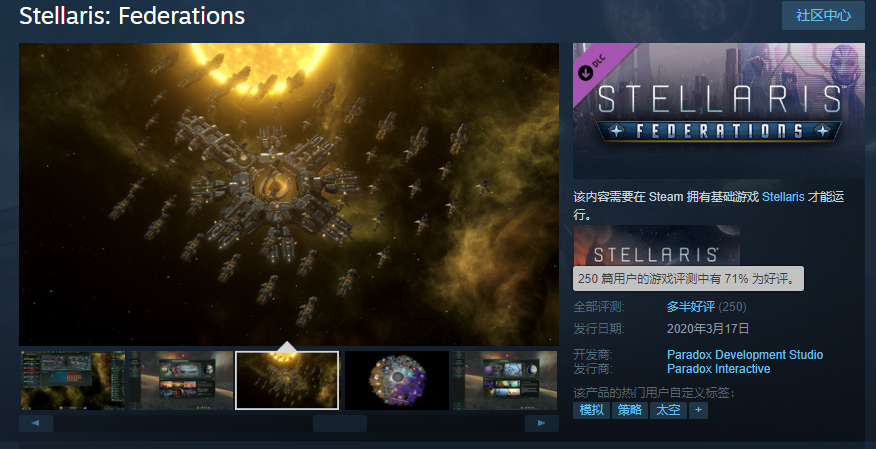 P社的太空模拟策略经营大作《群星》于昨(17)日喜提最新大型拓展包“联邦”。官方将其描述为对游戏中外交玩法的一种革新,让玩家与AI之间的关系更加复杂多元,并重做了原本显得鸡肋的联邦功能等。一天过去如今该DLC的评价停留在了多半好评,有大批的国人玩家在Steam吐槽留言表示该DLC如今又是一次大型“付费测试”。