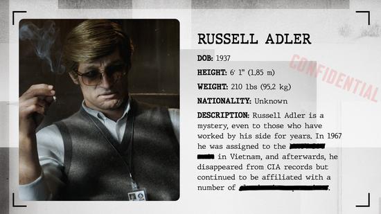 最后是拉塞尔·阿德勒,他将领导这个小组。他是一名资深的中情局特工,尽管他的过去一直被保密,不过阿德勒已经被证明是一个可靠的特工,他将领导对“珀尔修斯”的追捕。他在《使命召唤17:黑色行动 冷战》的大部分预告片和已发布的剪接镜头中得到了大力宣传,所有这些都使阿德勒成为《黑色行动 冷战》故事中非常重要的人物。