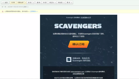 1、前往游戏官网,然后点击最下方的点击注册。在弹出的窗口中填入自己的电子邮箱,就会立即收到系统自动发送的确认邮件。