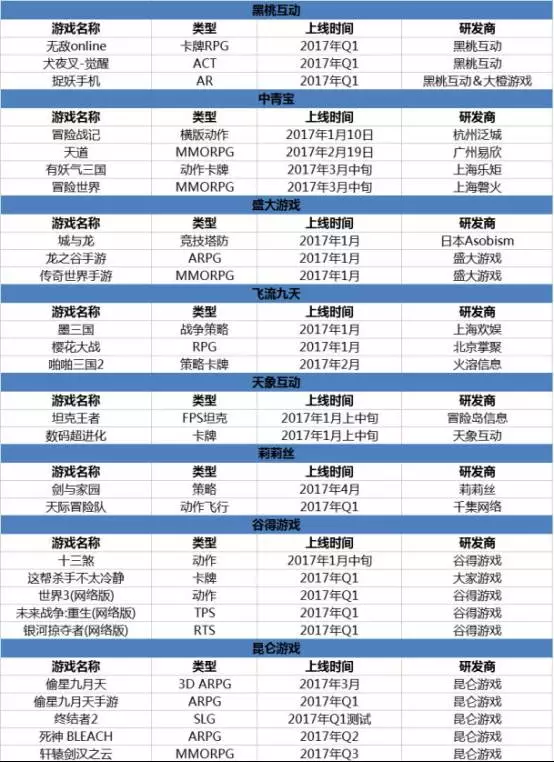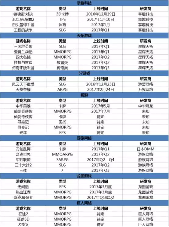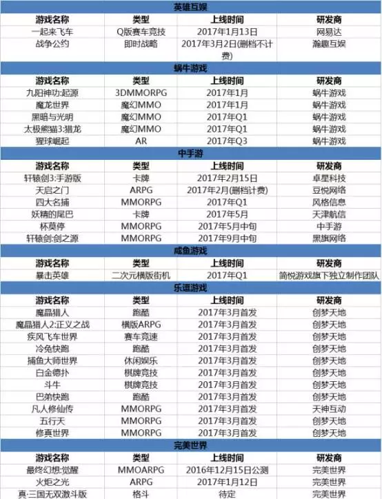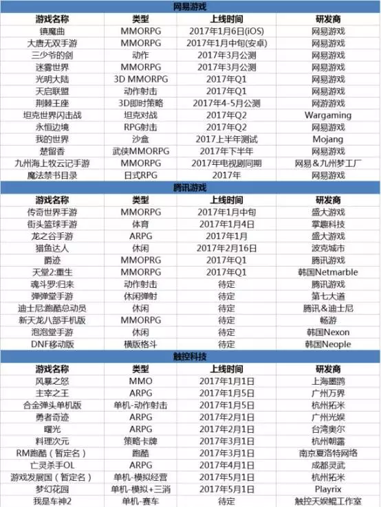 而在2017年的游戏产品发行计划中,不难发现,有少数厂商的产品未能如期上线,并顺延至2017年Q1,也有不少产品在2017年的发行时间处于待定状态。这或许与2016年施行的版号新规不无关系,版号实施过程较慢导致部分产品版号过审,推迟上线;同时,厂商自身策略的调整也可能导致部分产品延迟上线,这也属于正常现象。