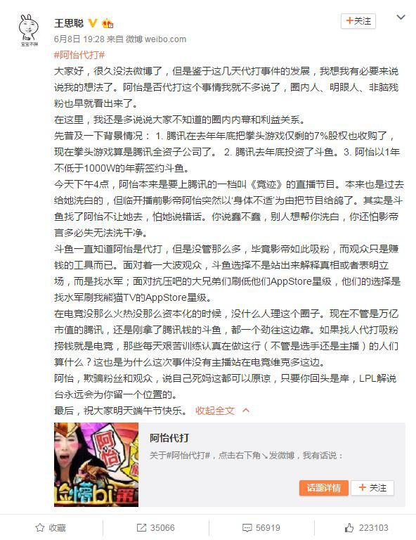 2016年6月,关于阿怡代打事件基本已经真相大白,而很多人有疑问的是阿怡刚刚拒绝了熊猫的签约,王校长还第一时间为爆料人点了赞,是不是意味着校长亲自出手要抹黑搞垮阿怡。而王校长一篇微博把事情说的明明白白,导致阿怡无路可退,只能承认代打,尽管她表示自己是熊猫和斗鱼斗争的牺牲品,但是已经没有人理睬了。值得一提的是,9月份阿怡复出后,董小飒爆料举报阿怡的就是斗鱼的一名主播,而后阿怡转战全民时表示自己不想再参与平台内斗,不得不说影帝贵人多忘事,这么快就从平台之争变成了内部之争。