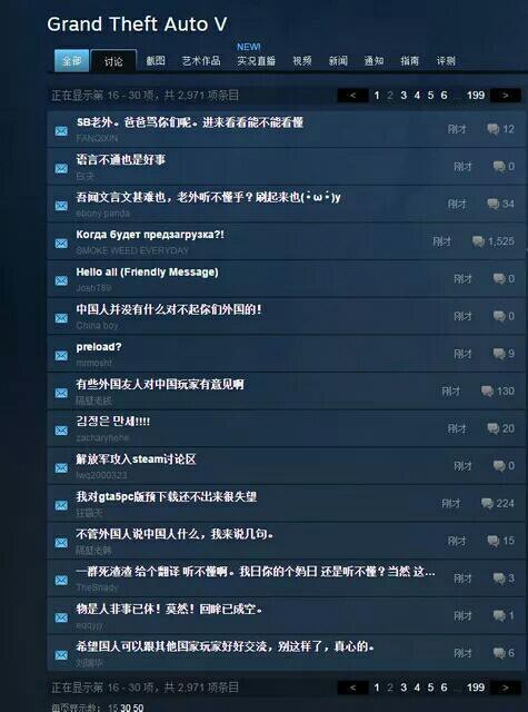 2015年4月,Steam的《GTA V》讨论区里涌入了大量使用中文发帖刷屏的大陆玩家,一度引发了外国玩家的抗议。