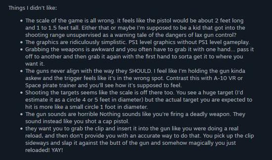不过,吐槽归吐槽,游戏最反人类的还是操作方式。还有玩家称,想要在游戏开一枪,难于上青天!玩家需要一直用手按着手柄才能把枪拿起来,经常需要在两只手里倒来倒去才能找到正确的姿势,即使成功拿起枪,扳机的位置也不对,装弹药的方式也是个谜……这也就是打纸板,如果换成别的游戏,早就不知道死了多少回了!