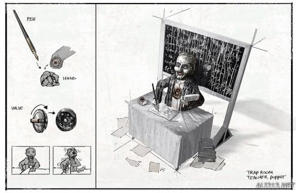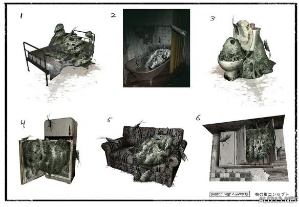 这新一批原画中有几个场景曾经出现过,像是“生日快乐”的房间和投影仪谜题的木制雕像,都似曾相识,除此之外还有贝克大宅中各处虫巢的设计,光看草图就让人起了一阵阵鸡皮疙瘩,和贝克一家被感染前的景象形成了鲜明的对比。